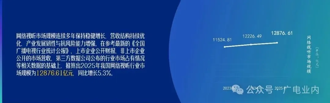 2025年,我国网络视听行业市场规模达12876.61亿元,同比增长5.3%,连续多年保持稳增长。网络视听产业发展韧性强、潜力大、空间广。
