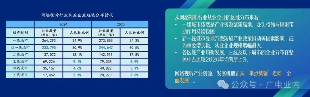 一线城市依然是产业资源聚集高地,龙头引领与辐射带动作用稳固;新一线城市在地方微短剧产业政策等因素的推动下,从业企业规模增幅最为显著。三线及以下城市的企业分布在整体中占比较2024年均有所上升,网络视听产业资源、发展机遇正从“单点集聚”走向“全面发展”。