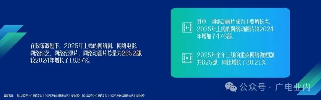 2025年剧、影、综、纪、动上线总量为2652部,较2024年增长了18.87%;全年上线重点网络微短剧共 625部,同比增长了30.21%。