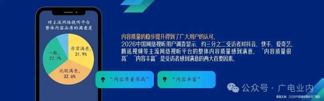 内容质量的提升赢得了广大用户的认可。据调查,64.5%的受访者对视听内容感到满意,“内容质量很高”“内容丰富”是满意的两大首要因素。