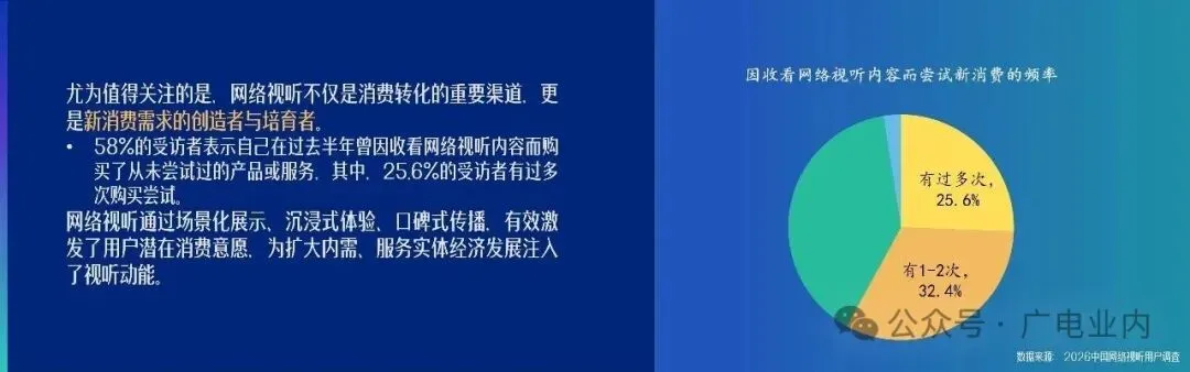 网络视听已成为激活消费潜力、创造增量需求的重要驱动力。数据显示,58%的受访者在过去半年内因收看网络视听内容,购买了此前从未尝试过的产品或服务,其中25.6%的受访者有过多次购买经历。