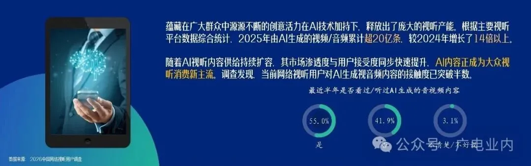生成式人工智能技术的进步催生出的“人机协同”生产模式,正从创新探索转变为行业“标配”,深刻重塑了视听内容生产体系,释放出了庞大的视听产能。2025年由AI生成的视频/音频累计超20亿条,较2024年增长了14倍以上。