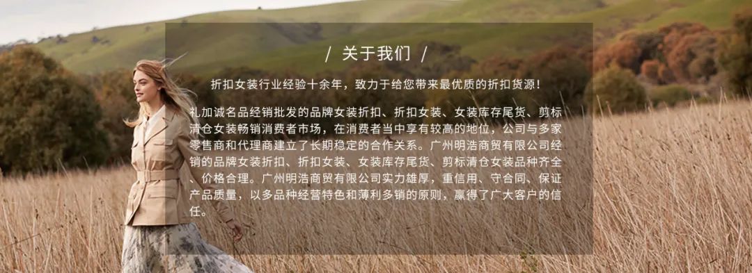 品牌折扣女装库存尾货批发就找广州礼加诚(明浩)品牌女装专柜货源供应商,电商直播货源渠道,尾货批发,库存女装一手货源,品牌女装折扣店进货渠道,抖音快手淘宝直播货源供应链平台商家。品牌折扣女装尾货批发哪家好,广州明浩礼加诚。