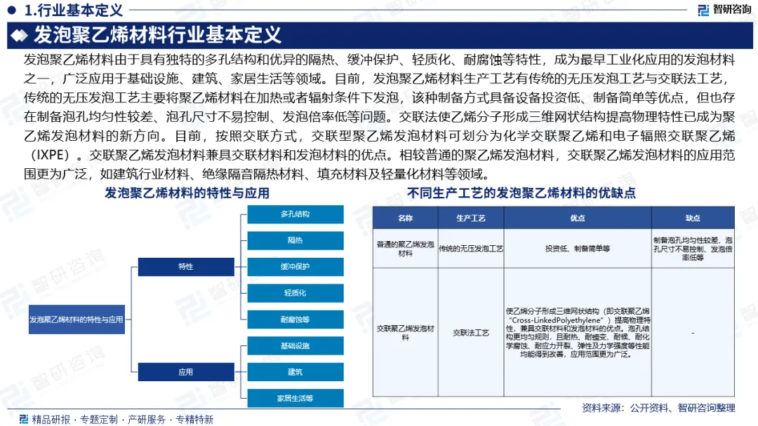 行业基本定义:泡沫塑料也可称为塑料发泡材料,聚乙烯(PE)具有优良的物理化学性能,同时凭借其产量大、价格低廉、易获得等优点,被广泛应用于各种领域。发泡聚乙烯材料由于具有独特的多孔结构和优异的隔热、缓冲保护、轻质化、耐腐蚀等特性,成为最早工业化应用的发泡材料之一,广泛应用于基础设施、建筑、家居生活等领域。