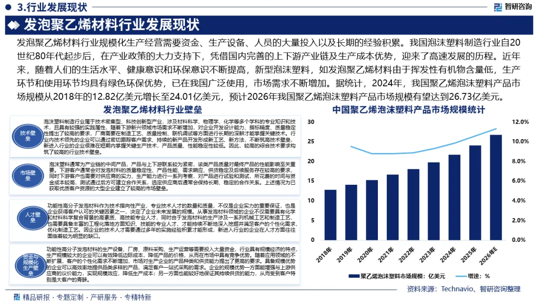 市场规模:近年来,随着人们的生活水平、健康意识和环保意识不断提高,新型泡沫塑料由于挥发性有机物含量低,生产环节和使用环节均具有绿色环保优势,已在我国广泛使用,市场需求不断增加。据统计,2024年,我国聚乙烯泡沫塑料产品市场规模从2018年的12.82亿美元增长至24.01亿美元,预计2026年我国聚乙烯泡沫塑料产品市场规模有望达到26.73亿美元。