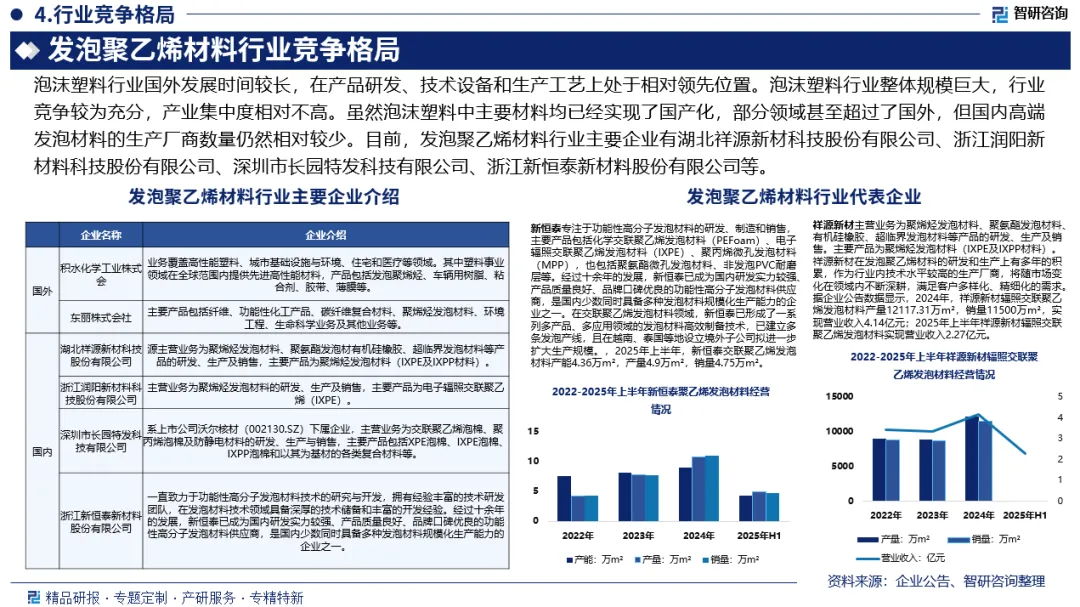 竞争情况:泡沫塑料行业国外发展时间较长,在产品研发、技术设备和生产工艺上处于相对领先位置。泡沫塑料行业整体规模巨大,行业竞争较为充分,产业集中度相对不高。虽然泡沫塑料中主要材料均已经实现了国产化,部分领域甚至超过了国外,但国内高端发泡材料的生产厂商数量仍然相对较少。目前,我国发泡聚乙烯材料行业主要企业有祥源新材、润阳科技、长园特发、新恒泰新材等。