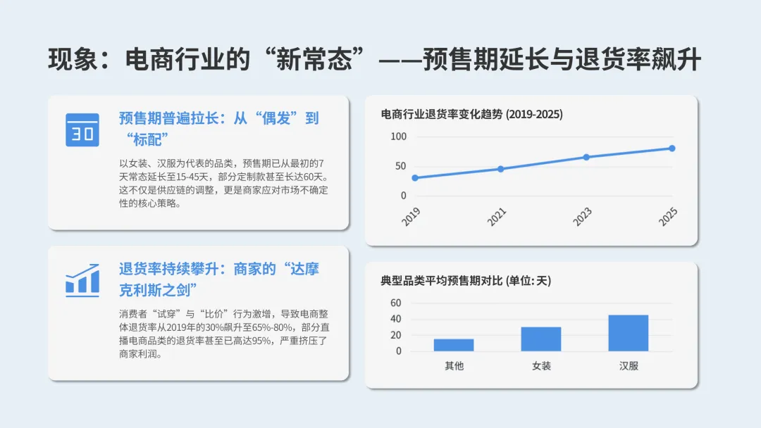 在电商行业,预售早已不是“双11”大促的专属玩法,而是成为了中小商家应对高退货率的“生存标配”。女装、汉服等品类的预售期从最初的7天,普遍拉长到了15-45天,部分甚至长达60天。与此同时,退货率也从2019年的30%飙升至如今的65%-80%,部分直播电商更是高达95%。当预售期延长与高退货率形成闭环,这场看似“双输”的博弈背后,谁才是真正的财务受益者?我们将从现金流、风险转移、会计处理等多个维度,结合真实数据案例进行深度拆解。