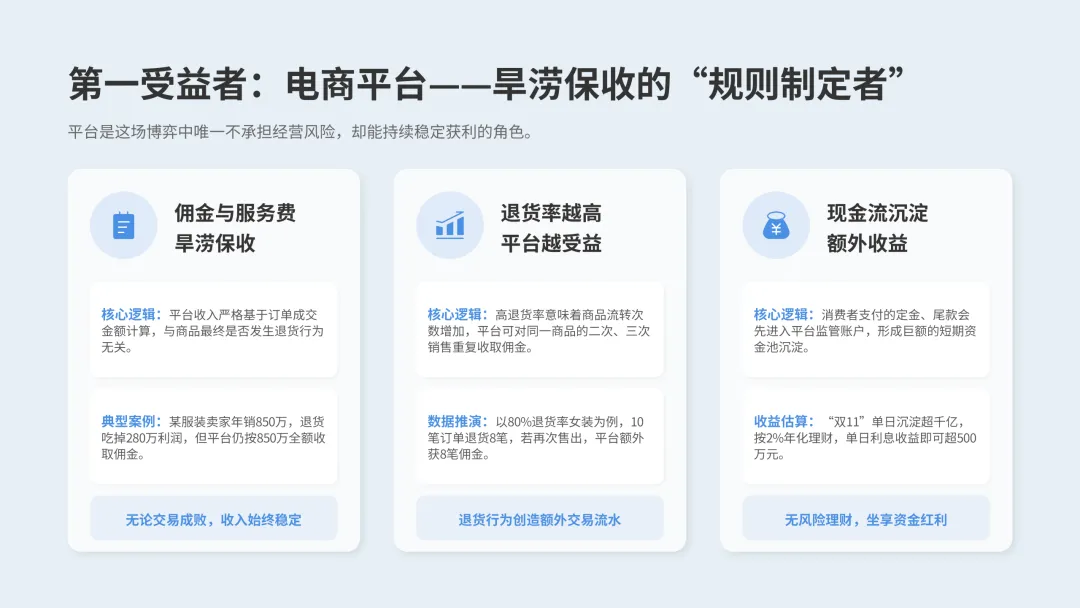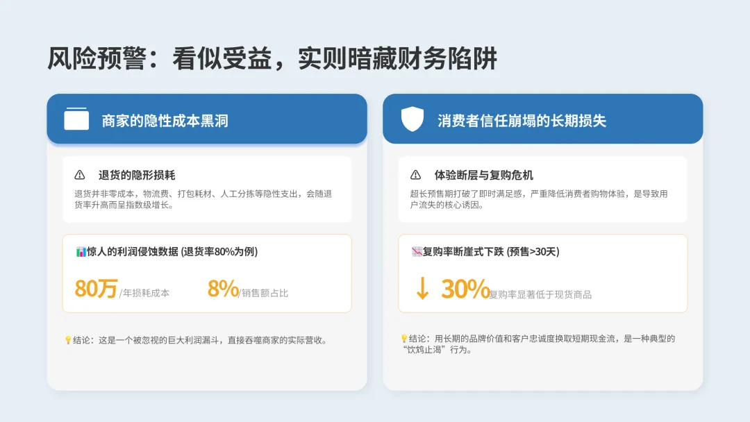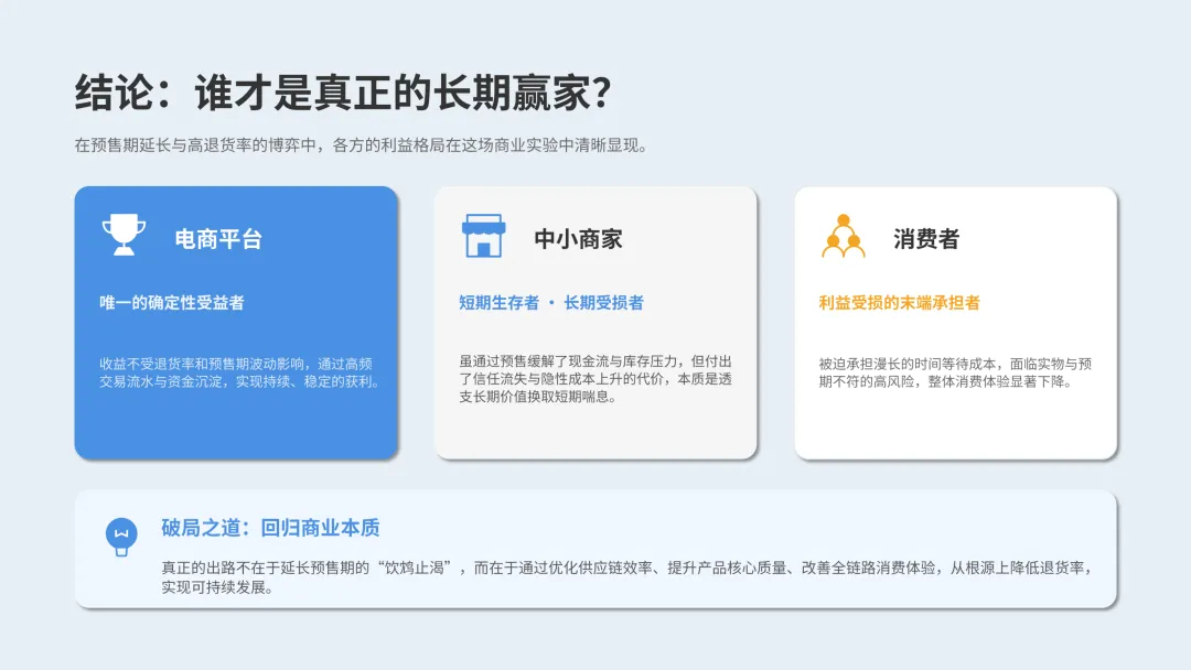 在预售期延长与高退货率的博弈中,电商平台是唯一的确定性受益者,其收益不受退货率和预售期的影响,且能通过多次交易和资金沉淀持续获利。中小商家虽然通过预售模式缓解了短期现金流压力,降低了库存风险,但也付出了消费者信任下降和隐性成本上升的代价,本质上是用长期品牌价值换取短期生存空间。而消费者则是这场博弈中的最终受损者,不仅要承担等待成本,还要面临实物与预期不符的风险。