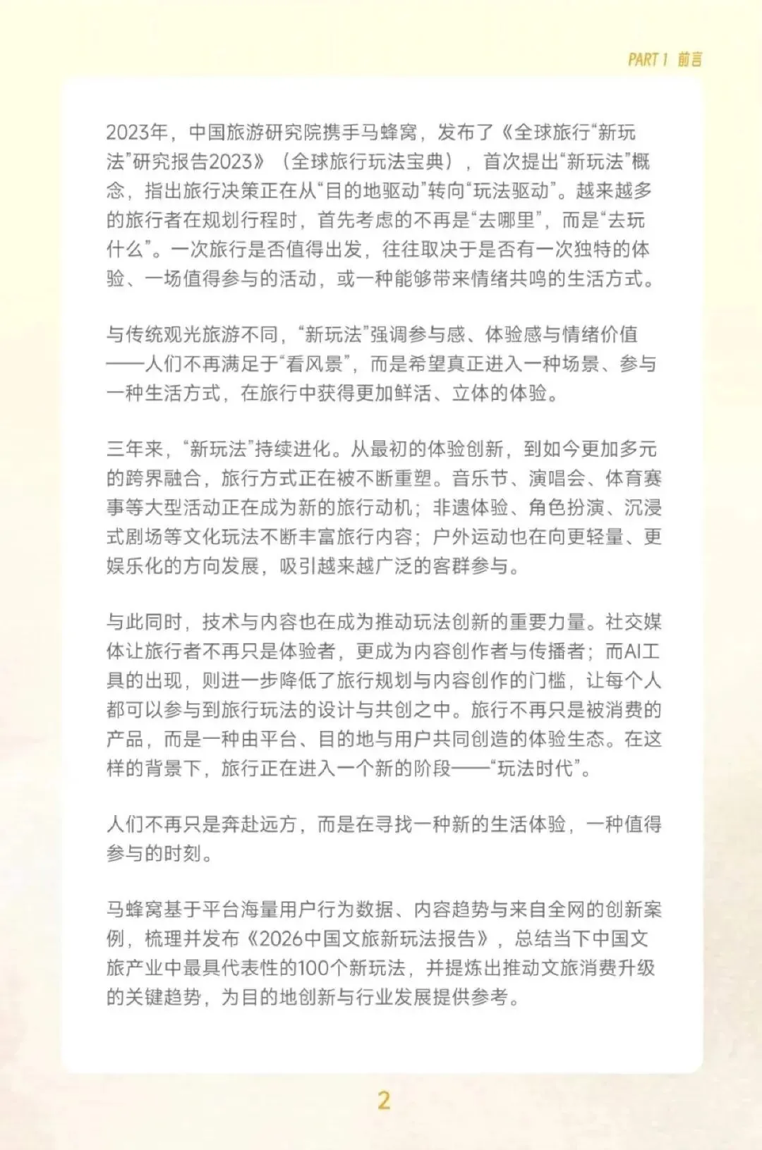 2026 年的中国文旅市场,正站在一个全新的起点上。玩法时代的到来。为整个行业带来了前所未有的机遇,也提出了更高的要求。那些能够敏锐捕捉用户需求变化。持续创新玩法体验的目的地和企业。必将在这场变革中脱颖而出。成为新时代的领跑者。而对于普通的旅行者来说。这是最好的时代。因为有无数种全新的方式。等待着我们去重新打开中国。去发现那些隐藏在山水之间和城市角落的美好。去体验那些独一无二的生活。去创造属于自己的旅行故事。