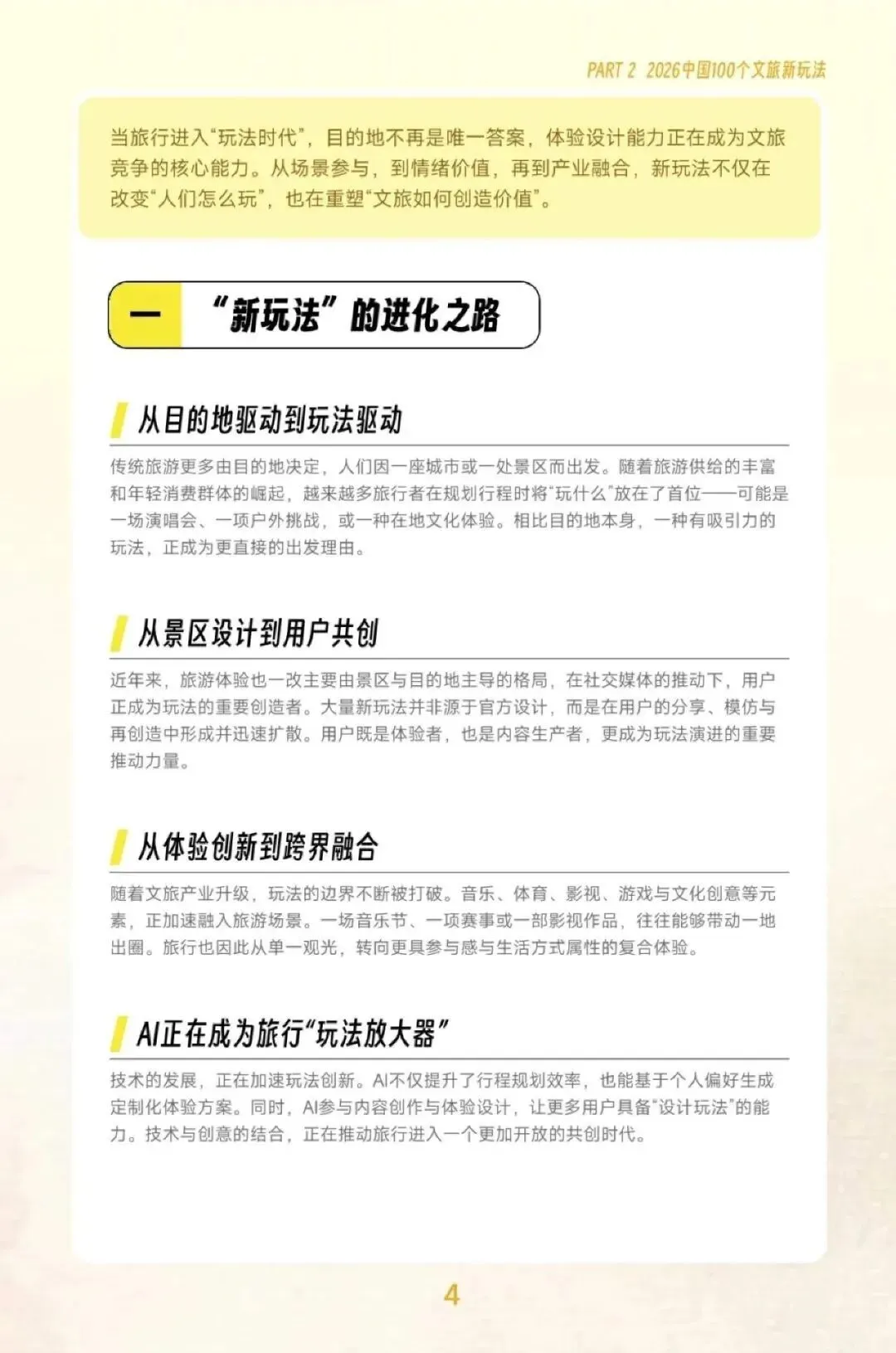 第四条路径是 AI 成为旅行的玩法放大器。技术的发展正在加速玩法的创新迭代。AI 不仅能大幅提升行程规划的效率。还能基于个人偏好生成定制化的体验方案。同时 AI 参与内容创作和体验设计。让更多普通用户具备了设计玩法的能力。技术与创意的深度结合。正在推动旅行进入一个更加开放的共创时代。未来,每个人都可以根据自己的兴趣和需求。设计出独一无二的旅行玩法。并分享给更多的人。这将彻底改变文旅产业的生产方式。