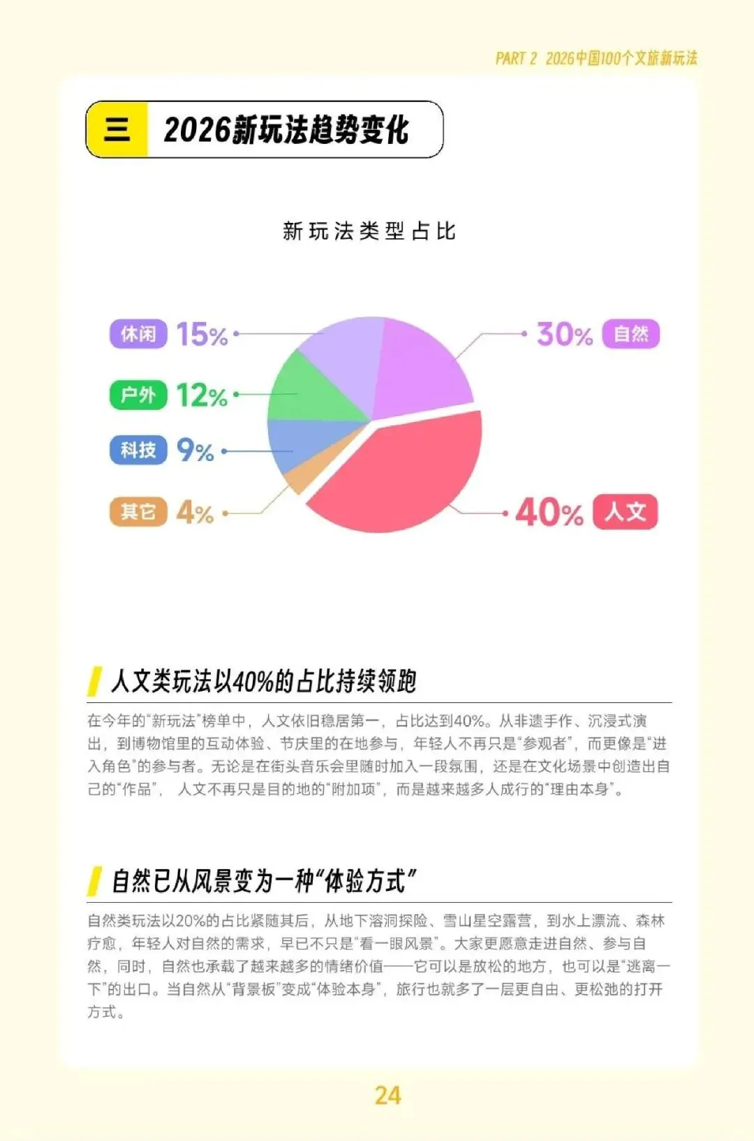 休闲类玩法占比 15%。户外类占比 12%。科技类占比 9%。其他类型占比 4%。不同类型的玩法相互渗透相互融合。形成了多元丰富的文旅生态。比如科技与自然的结合,诞生了各种沉浸式的自然体验项目。文化与休闲的结合,催生了众多城市微度假产品。体育与旅游的结合,让各类赛事成为文旅流量的新入口。这种跨界融合的趋势,正在打破传统文旅的行业壁垒。创造出无限的可能。
