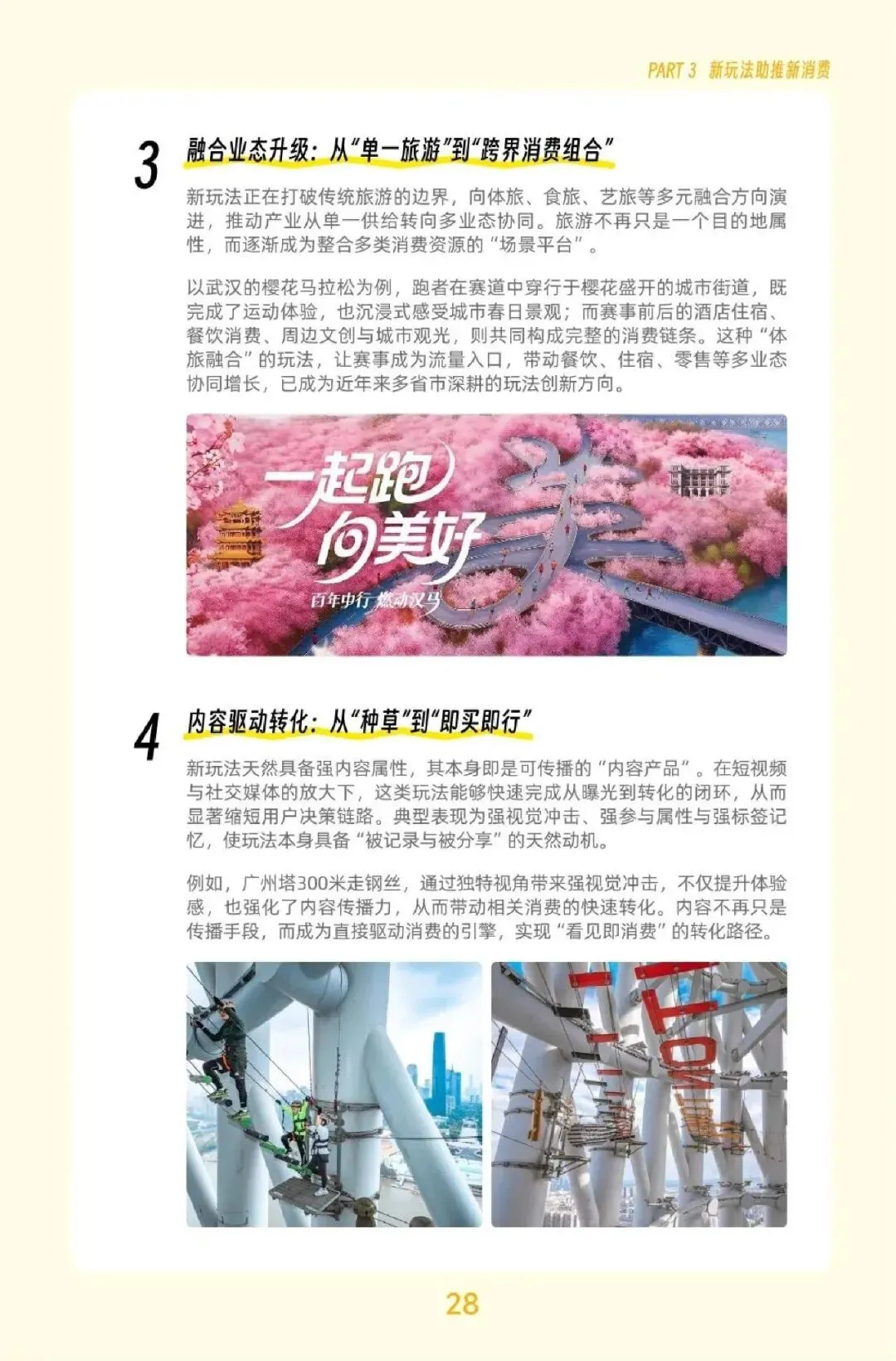 第三条路径是从体验创新转向跨界融合。随着文旅产业的不断升级。单一的体验创新已经难以满足消费者日益多样化的需求。玩法的边界被彻底打破。音乐体育影视游戏文化创意等元素。加速融入旅游的各个场景。一个事件一部作品一项活动。往往就能带动一个地方的文旅热度。旅行也因此从单一的观光活动。转向更具参与感和生活方式属性的复合体验。人们去一个地方旅游。不再只是为了看风景。还可以听音乐会看比赛逛市集学手艺。旅行的内容变得越来越丰富。旅行的意义也变得越来越多元。