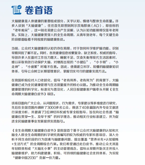 白皮书最终呼吁,大脑健康是全民健康工程,需要个人、家庭、企业、政府协同发力。从孕期呵护到老年照护,全周期守护、全场景干预、全维度支持,让每个人都能拥有健康认知、稳定情绪、敏捷思维,享受高质量生命旅程。