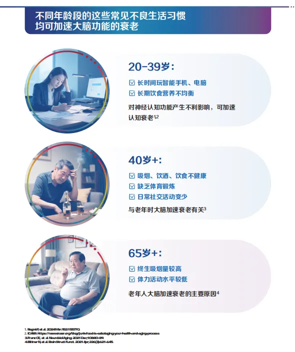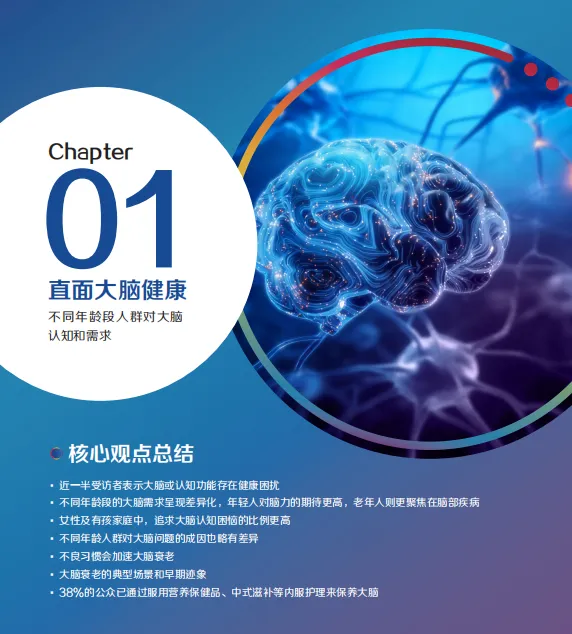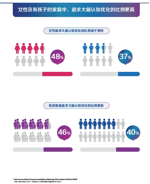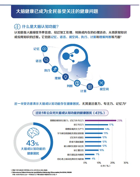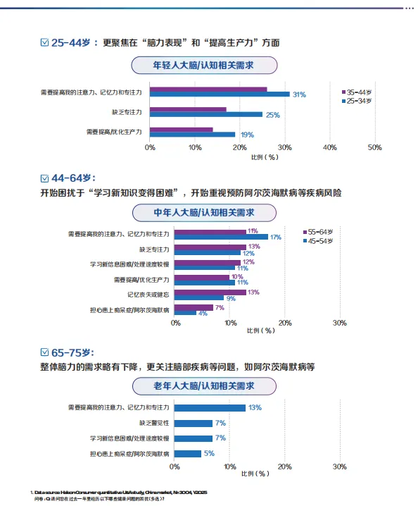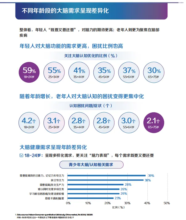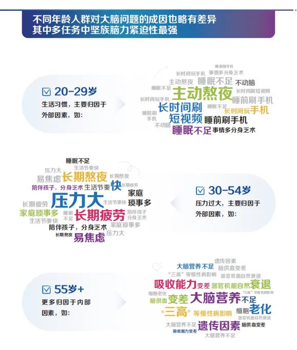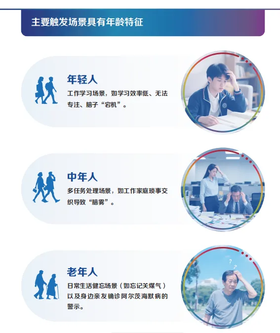 青年与中年群体成为脑健康高危人群,90 后、00 后长期熬夜、高压工作、久坐少动、饮食不规律,导致脑雾、焦虑、失眠、偏头痛高发,认知提前出现衰退迹象。数据显示,职场人群中 76% 存在记忆力下降、注意力难以集中的问题,脑健康问题呈现年轻化趋势。
