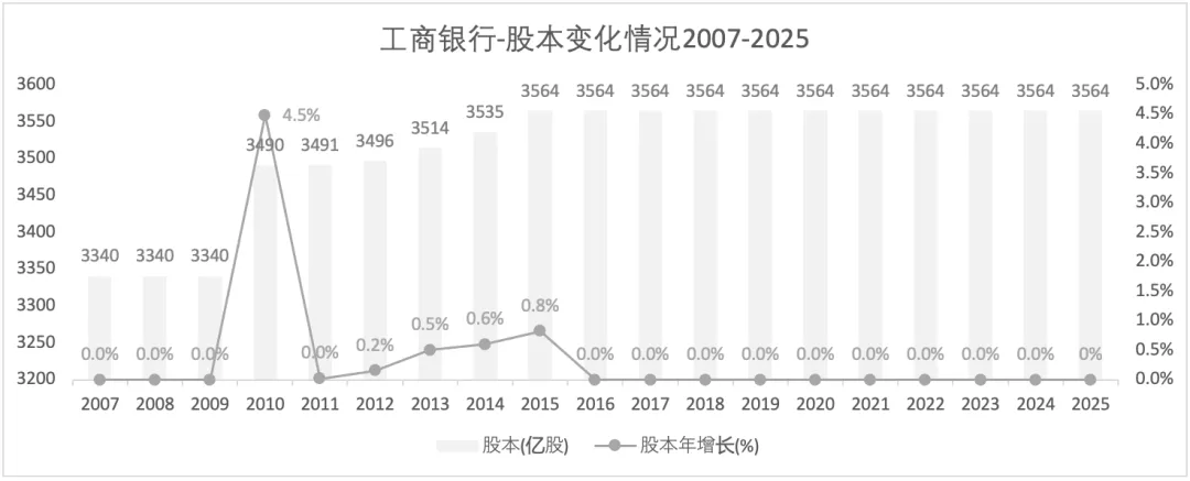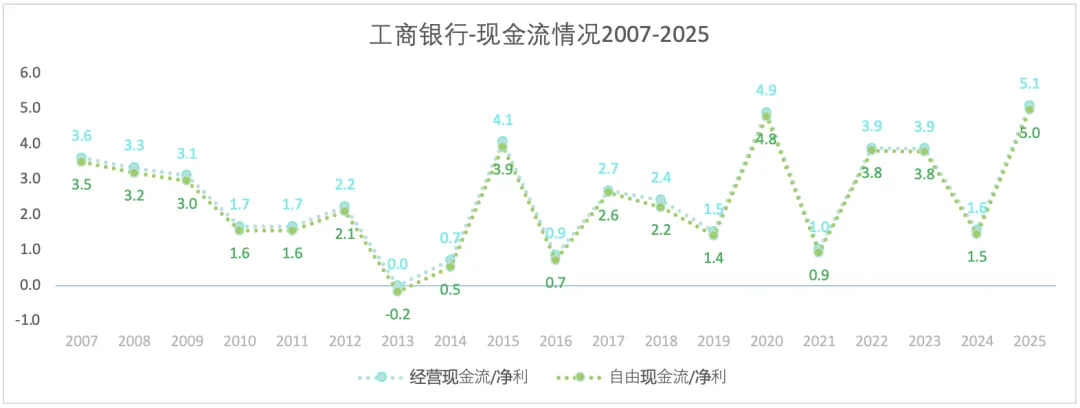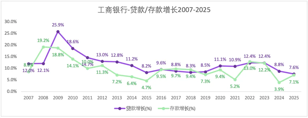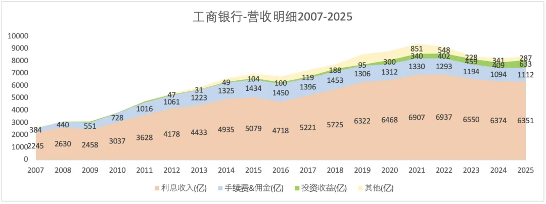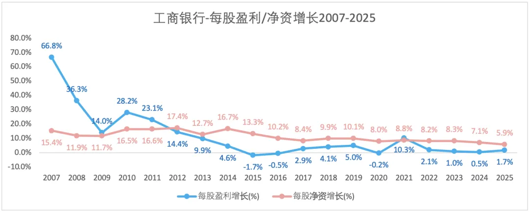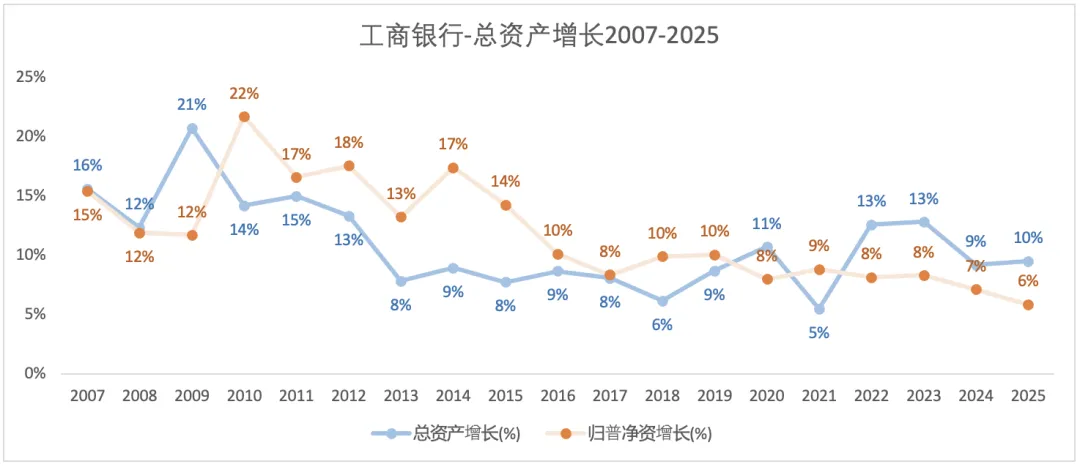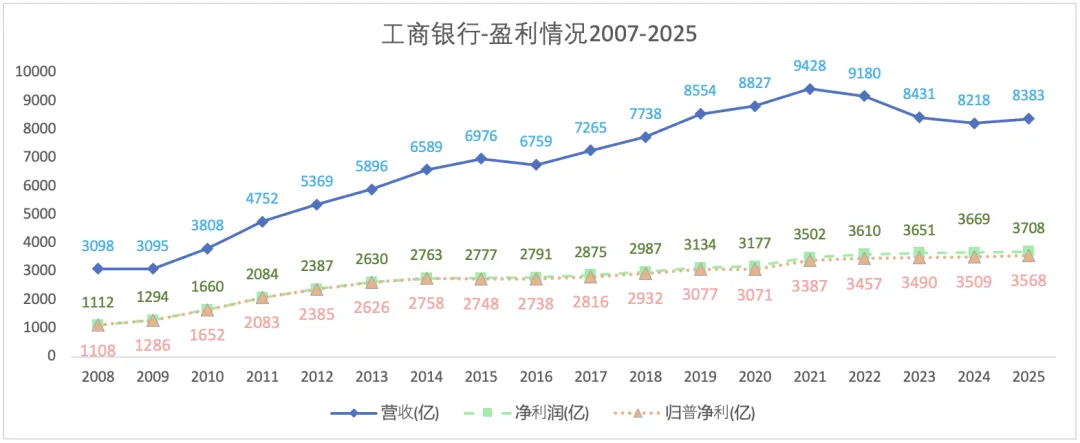营收:与中行在2021-2024年期间营收一直保持增长不同,工行在此期间营收下降明显,2025年营收增速转正。