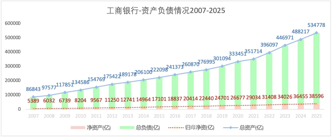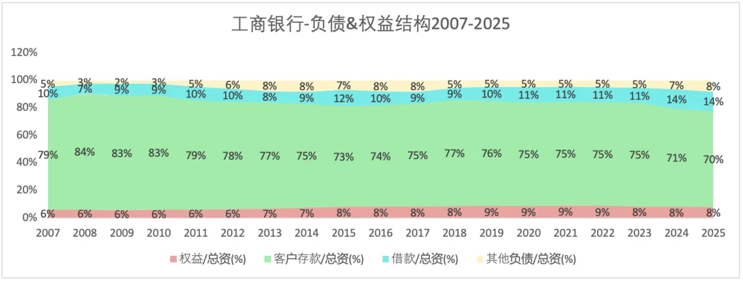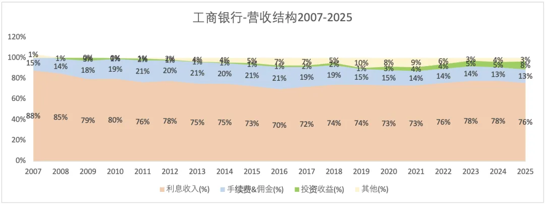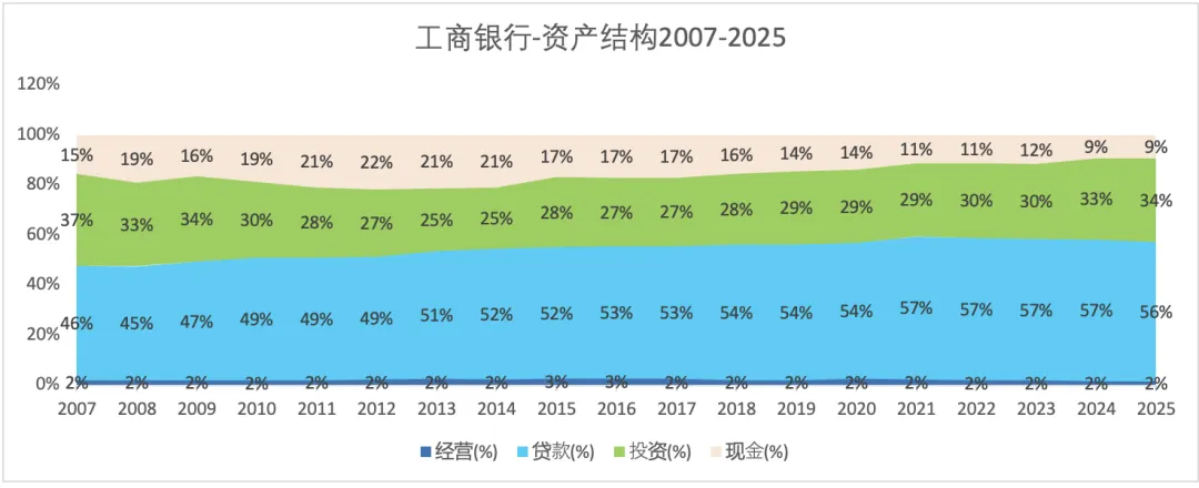 2025年末,工行的资产结构与招行的相当接近,相比上一年,贷款比例下降,同时投资比例上升。
