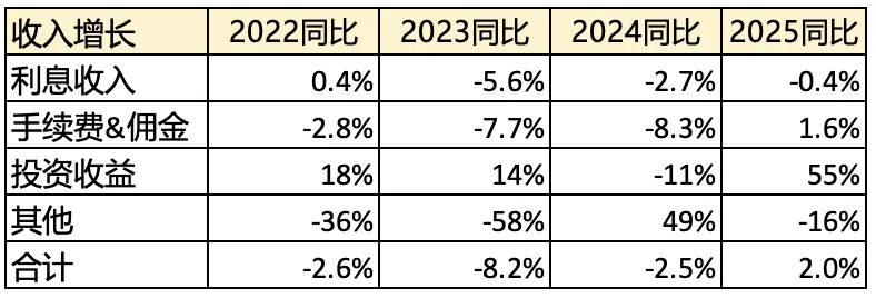 整体营收在2021年达到峰值,2022-2024营收呈现下滑趋势,不过2024年下滑速度放缓。营收下滑主要是由于利息收入和手续费&佣金收入减少导致。2025年营收恢复增长,主要是由于投资收益增长55%。