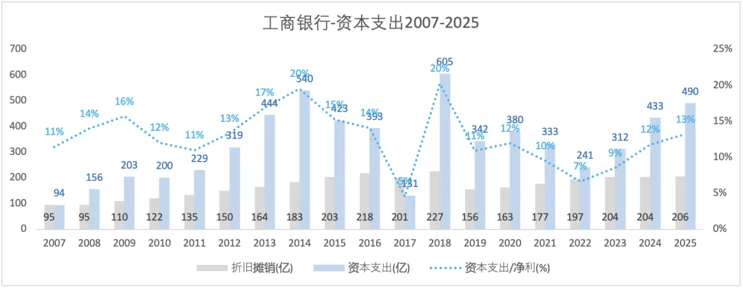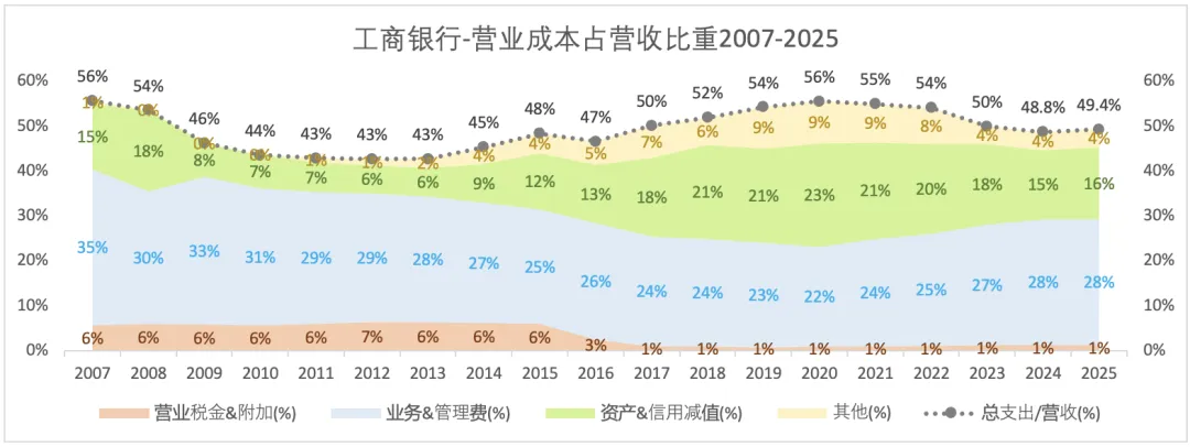 2025年,工行的营业总支出占营收比介于中行与招行之间:中行(54.4%)>工行(49.4%)>招行(46.7%)。造成这个差别的主要原因是:资产信用减值占比和业务管理费用的不同。招行的资产信用减值占比最低。