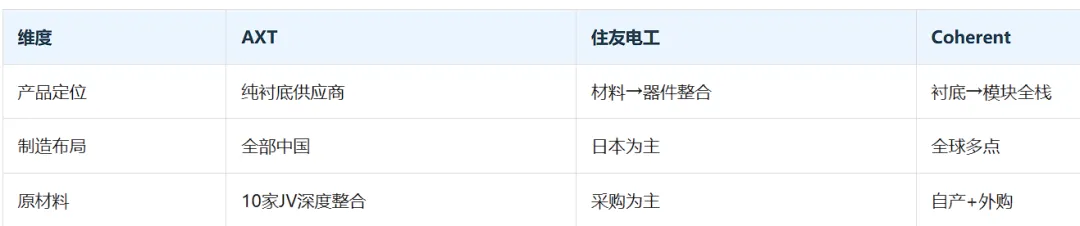 相比之下,竞争对手住友电工以采购为主,Coherent虽全栈布局但成本结构不同。AXT的“纯衬底+中国制造+上游整合”模式,使其在价格和供应稳定性上具备独特竞争力。