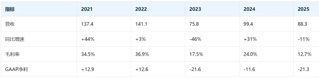 2023年行业周期腰斩,2024短暂回暖,2025再度陷入亏损。但积极信号是:2025年Q4毛利率已回升至20.9%,且年底完成增发募资8696万美元,在手现金约1.2亿美元。