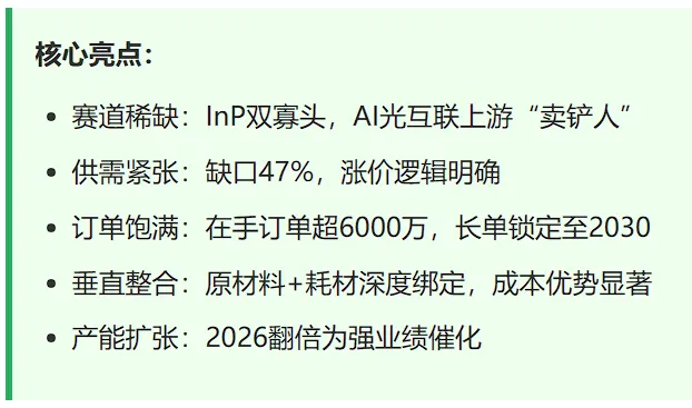 AXT在2026年2月披露,InP在手订单超6000万美元,创历史新高,且长单已锁定至2030年以后。