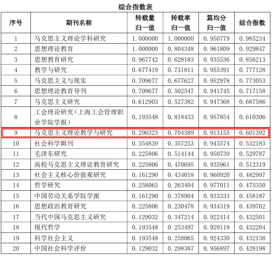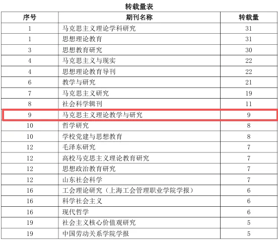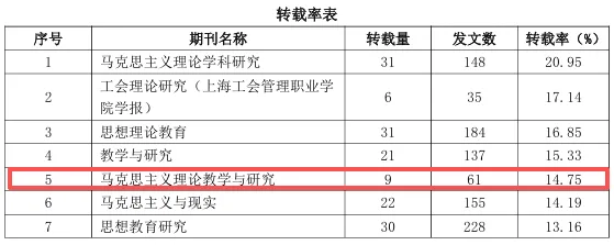 4月18日,中国人民大学人文社会科学学术成果评价研究中心与书报资料中心联合发布了《复印报刊资料转载指数研究报告(2025年度)》。在全国马克思主义理论学科期刊中,《马克思主义理论教学与研究》多项核心评价指标均有所上升。数据显示,本刊在马克思主义理论学科领域表现强劲,转载量位居第9位,转载率排名第5位,综合指数名列第9位。