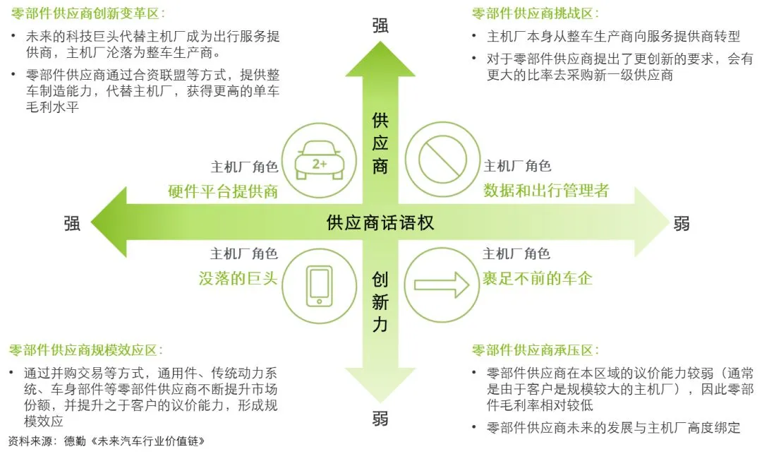 德勤汽车风险咨询团队建议汽车零部件供应商依据下游客户及整体行业的需求投资变化,充分孕育能源革命、智能网联和智能制造三大革新驱动力,以应对汽车产业变革。根据德勤2025年汽车厂商四大情境假设:“数据和出行管理者”、“硬件平台供应商”、“没落的巨头”和“裹足不前的车企”,以供应商创新力及供应商话语权为维度,德勤汽车风险咨询团队推演出零部件供应商的四大应对区域:“挑战区”、“创新变革区”、“规模效应区”和“承压区”。