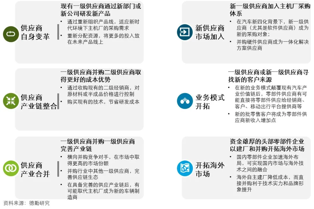 面对以汽车厂商为主体客户的零部件供应商,在采购习惯、采购对象、采购方式等变化以及未来汽车产业的破局变革的环境下,将呈现六大发展趋势:供应商自身变革、供应商产业链整合(纵向)、供应链产业合并(横向)、新供应商市场加入、业务模式开拓、开拓海外市场。一系列主动出击的举措将有效帮助零部件企业在变革浪潮前突破重围,从容面对。