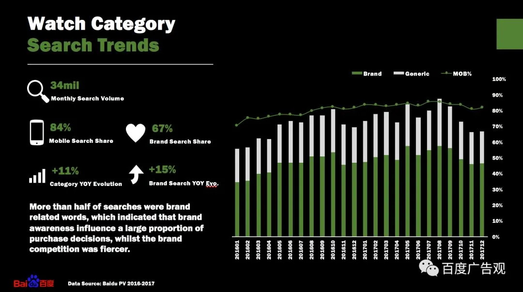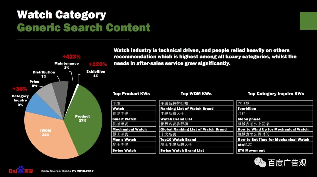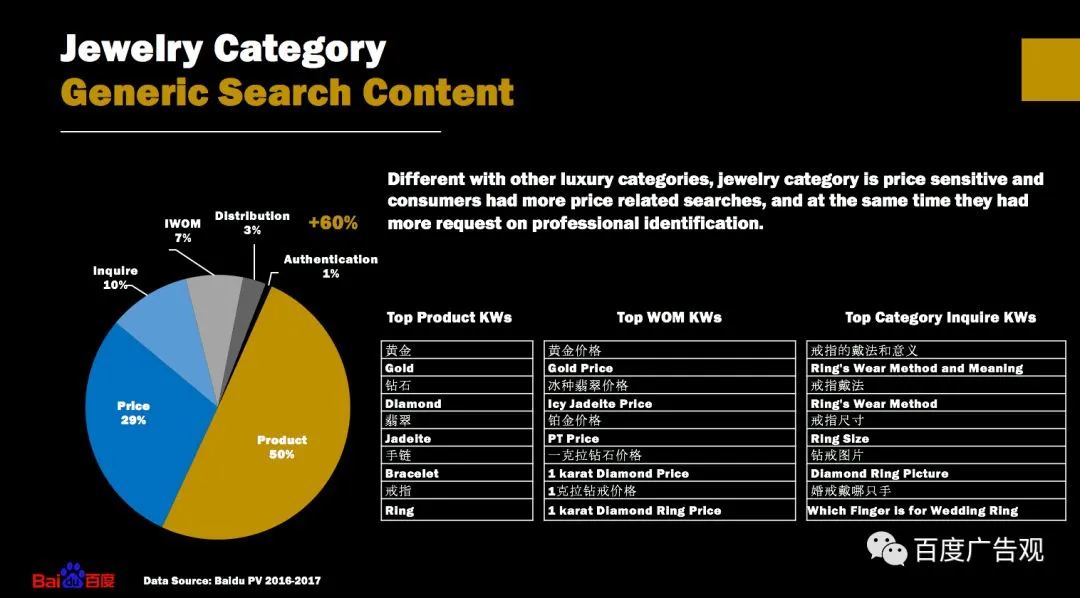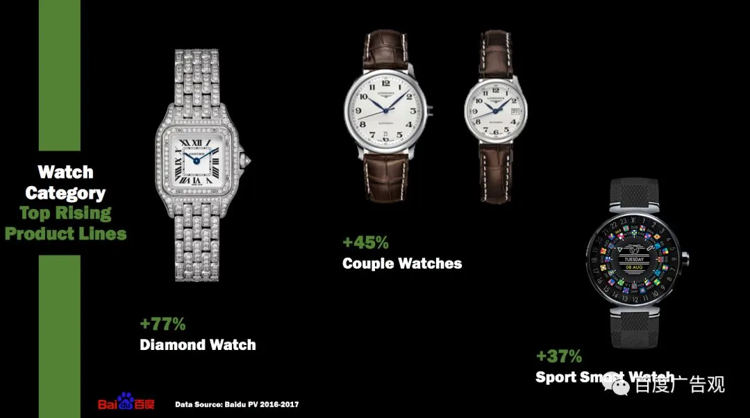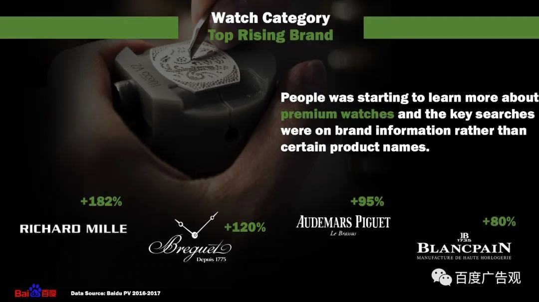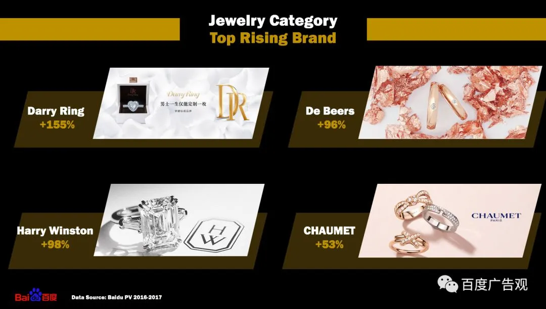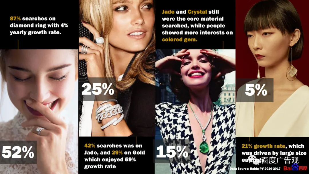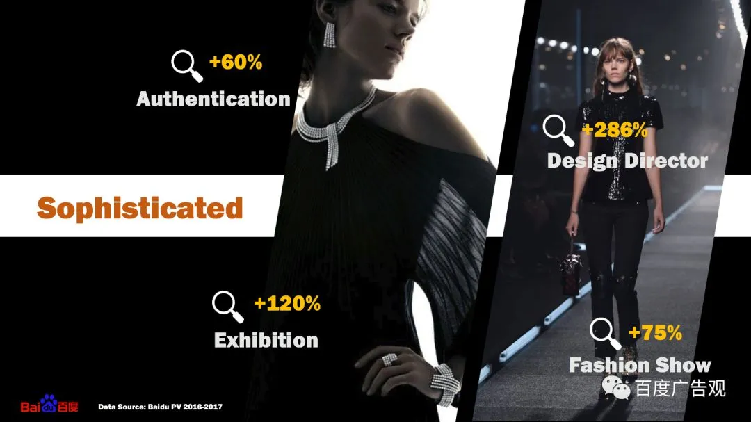 在过去一年里,我们发现中国消费者越来越关注一些行业知识类的信息,对于珠宝,他们在珠宝鉴定相关词的检索增幅60%,而在腕表上,他们更关注“巴塞尔表展”和“日内瓦表展”了,甚至也会喜欢了解时装秀和品牌的设计总监等等,所以说我们面对的是一群越发成熟甚至挑剔的消费者。