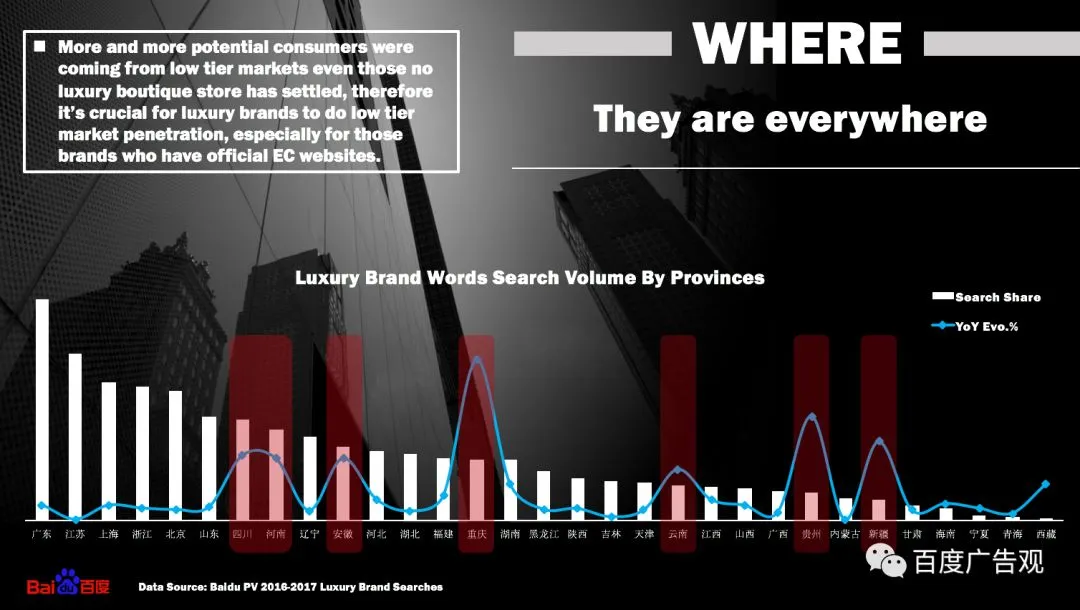 从不同省份对于奢侈品品牌词的检索占比来看,经济较为发达的广东、江苏、上海、浙江和北京五大市场共占40%,增速缓慢,但一些经济欠发达地区的增幅却十分明显,比如河南、安徽、贵州、云南等,这些市场的奢侈品店铺进驻速度和数量均十分有限,因此并不在品牌广告投入或者营销活动的优先级上。但就是因为实体店的缺乏,使得他们对于在线购物的需求更加强烈,因此对于奢侈品品牌,尤其是拥有自己EC平台的品牌,对于低线市场的营销覆盖显得十分重要。