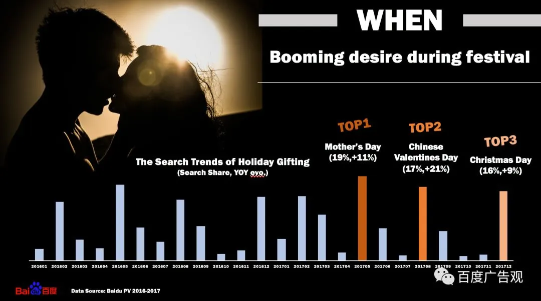 在2017年,母亲节超过了情人节成为礼物相关词检索量最高的节日,其次为七夕节和圣诞节。从趋势中我们可以发现,基本上每三个月就会有一个需要送礼物的节日,而且节日期间消费者对于品牌词的检索也会出现增长,尤其表现在珠宝和包包品类,因此如何在节日营销大战中抢夺消费者,成为其购物车中的一员,是每年营销的重中之重。