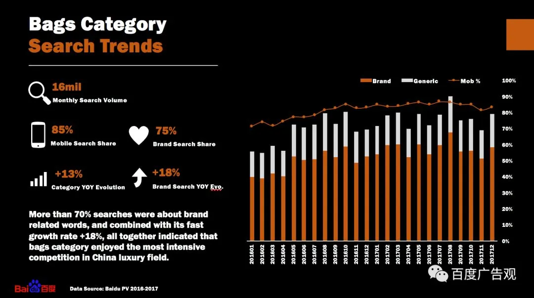 2017年,包袋行业月均检索量为16mil,其中85%来自手机端,同比增长13%,是四大品类中最高的,同时品牌词占比75%,增速18%,也是四大品类中最高的,可见品牌竞争激烈程度。而搜索高峰往往出现在节日前后,比如3月的妇女节、8月的七夕节和12月的圣诞节等。