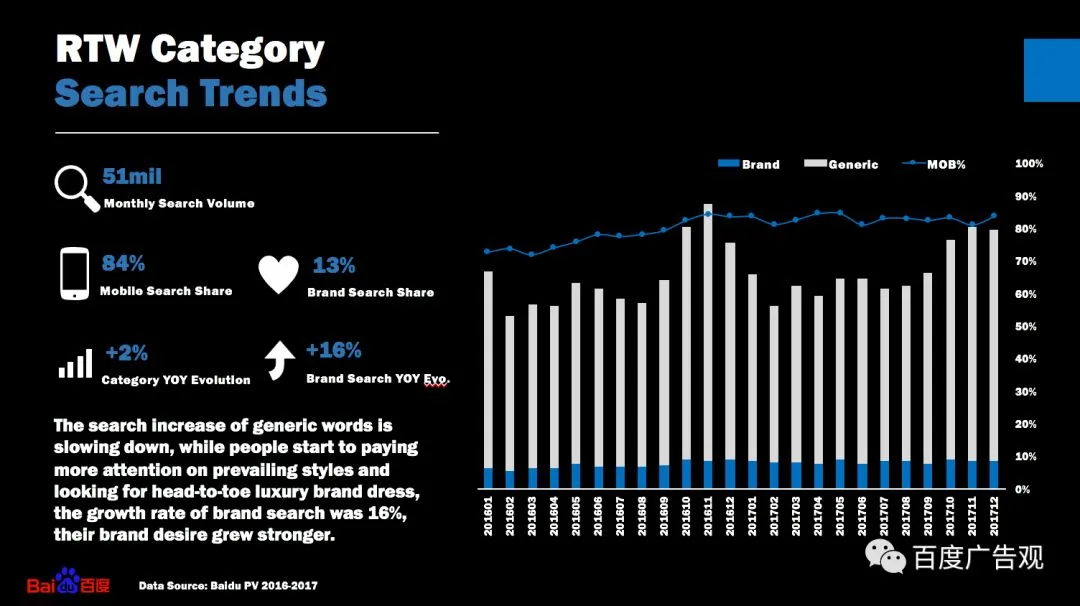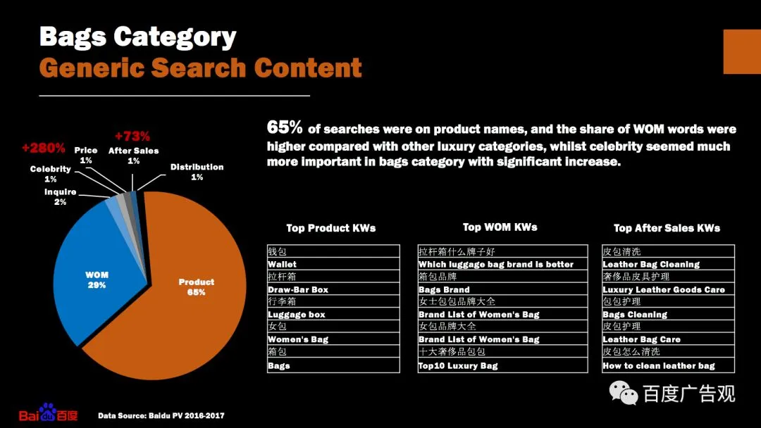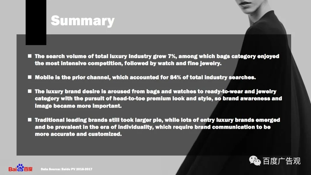 百度一直关注中国奢侈品消费者搜索行为的演变,此份报告着重分析了2017年中国奢侈品消费者针对不同品类的搜索行为和关注点,并分别探讨了搜索内容背后的潜在驱动因素,同时对于这群越发成熟甚至挑剔的人群,提出洞察及营销机会点。