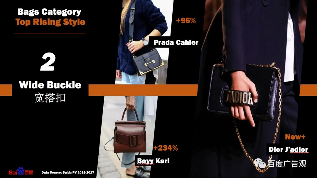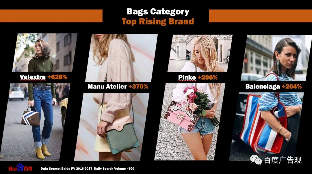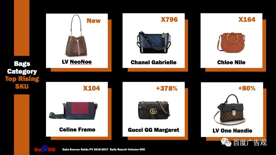 从通用词的检索内容来看,口碑词占据了29%,同时,明星同款包这类词的检索量涨幅高达280%,一款包包的流行很大程度上得益于明星的街拍和机场照,同时明星参演的电视剧中的包也是消费者搜索的重点,比如热播剧《我的前半生》中的“唐晶同款包包”等,因此,娱乐和明星资源依旧是奢侈品牌应该重视的发力点。