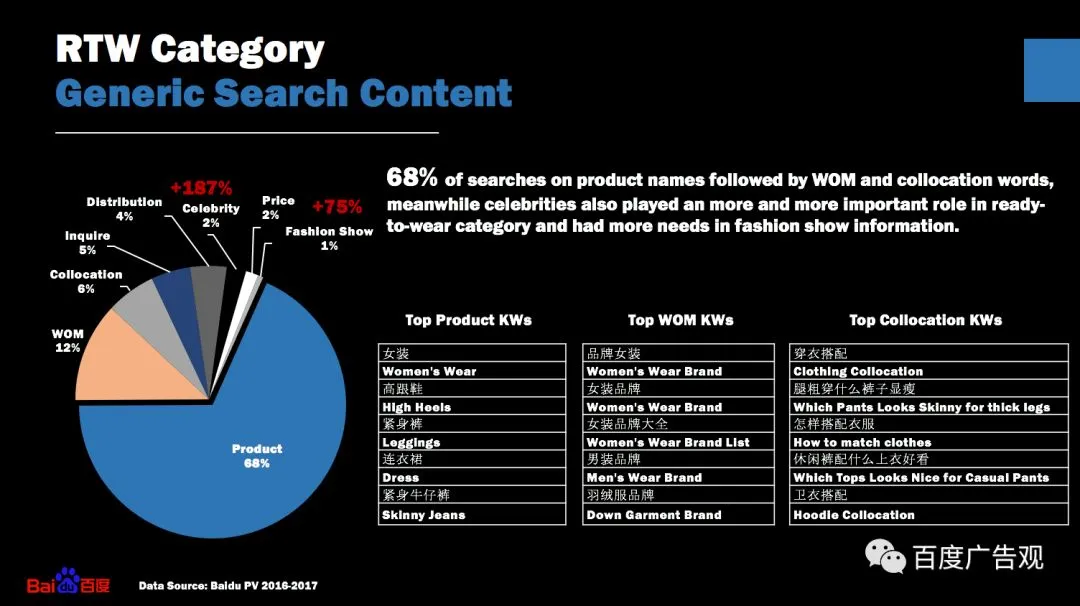 当我们深入分析这87%的非品牌词时,我们发现,其中68%还是一些品牌产品词,接着是口碑词占12%,比如消费者会搜女装品牌哪个好?羽绒服品牌等,用户希望从网络上获取更多关于产品的评价作为自己决策的判断依据。同时,我们发现明星同款产品的检索量出现激增,达187%。