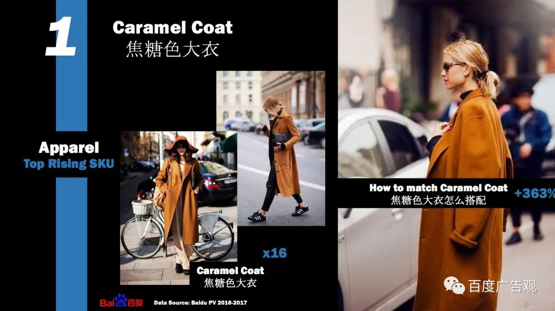 焦糖色无疑是这个秋冬最温暖的颜色,而其中最火的当是焦糖色大衣了,检索是去年的16倍,除了产品词之外,大家也在搜索搭配类的词,比如焦糖色大衣怎么搭配,配什么围巾,配什么毛衣等。