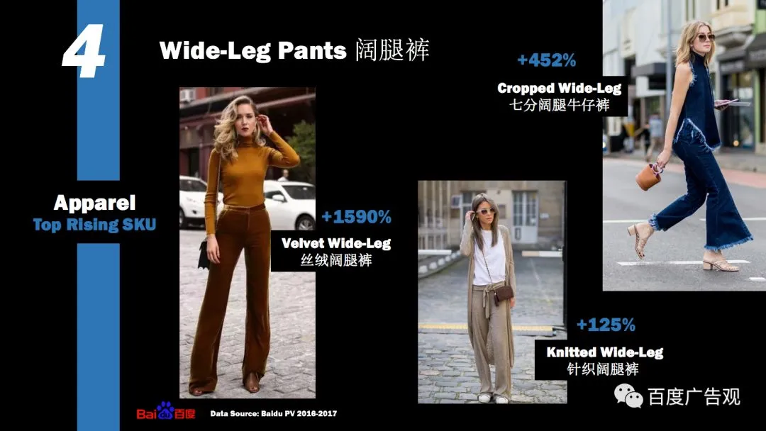 阔腿裤火遍了整个2017,从夏天的磨边阔腿牛仔裤到秋冬的丝绒和针织质地的阔腿裤,一直直备受街拍明星和时尚达人的宠爱,尤其是对腿部线条的修饰效果,堪称小粗腿救星,和猫跟袜靴搭配更配哦!