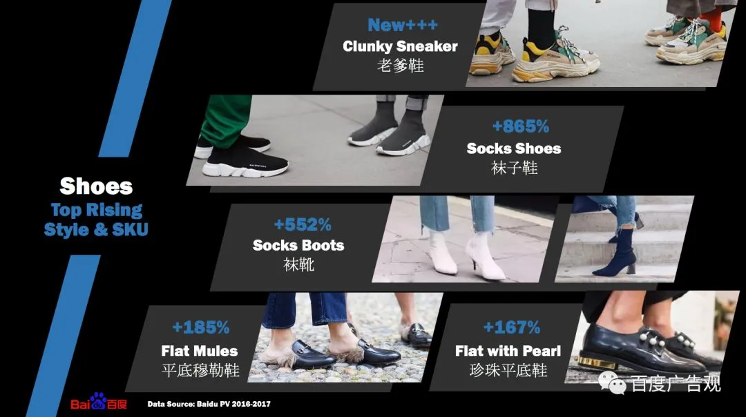就如之前提到的,巴黎世家可以说是今年热单的风向标,相继推出了袜子鞋和老爹鞋,带动了整个行业对于这类单品的热烈追捧。而袜靴则更将复古风发挥到了极致,猫跟鞋和马蹄跟的袜靴是这个秋冬必备的单品。而去年就大热的平底穆勒鞋则继续保持稳定增长,其中Gucci依旧是最受关注的单品,另一爆款则是杨幂带火的同款Coliac珍珠乐福鞋。