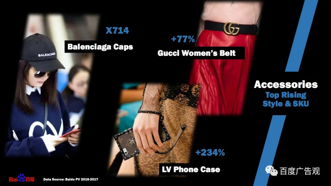 而在配饰热门单品中,增幅最快的是来自巴黎世家帽子,开始火于杨幂的机场照;另外Gucci皮带增幅77%,是该产品线中增幅最大的品牌;还有一个有意思的发现,消费者对于奢侈品品牌手机壳的检索增速明显,尤其是LV手机壳,增幅234%,这也是因为现在大家出门很多时候不带钱包,而手机则是必须的,所以一个奢侈品的手机壳往往比一个钱包更能展现你的高级感和品位。