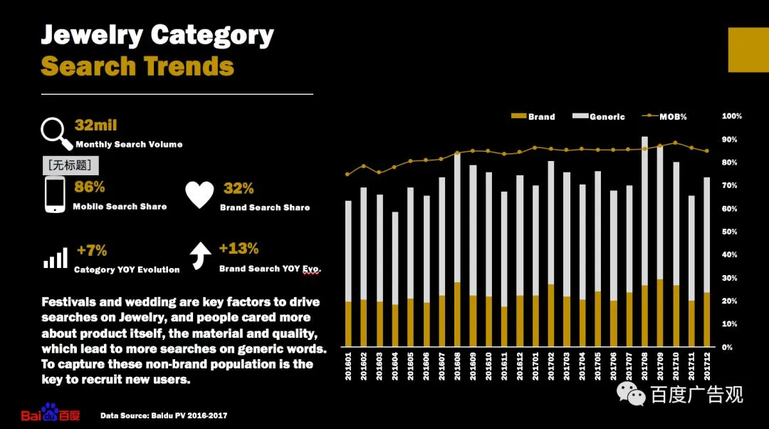 珠宝行业月均检索量为32mil,其中86%来自手机端,同比增长率为7%。珠宝行业受节日和婚庆影响颇大,金九银十往往是搜索高峰。由于消费者对于珠宝更为关注产品本身,因此品牌的检索量并没有很高,占32%,增速13%。