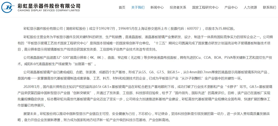 液晶面板:拥有咸阳 G8.5 + 产线,年产能 1200 万片 基板玻璃:已建成咸阳、合肥、张家港、成都四大基地,G8.5 + 基板玻璃年产能 1200 万片,国内市场占有率约 25%