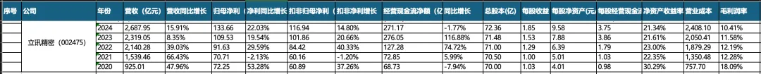 立讯精密24年总体营收2687.95亿,同比增长15.9%,归母净利润133.66 亿,同比增长22.03%,扣非归母净利116.94,同比增长14.80%,经营现金流净额271.17,同比增长-1.77%。