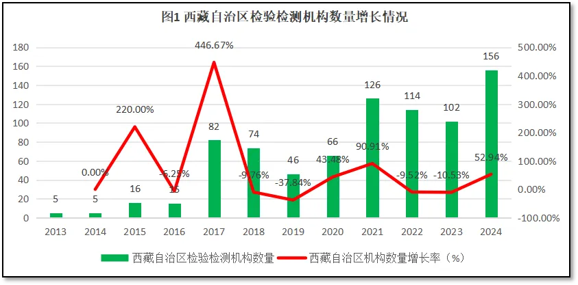 由图1可见,十二年来,西藏自治区检验检测机构数量从2013年的5家起伏波动增长到2024年的156家,创下历年新高。由于西藏自治区检验检测机构数量很少,统计工作开展不稳定,数据失真情况较严重,几十家的机构数量增减,就可能导致增长曲线的剧变。