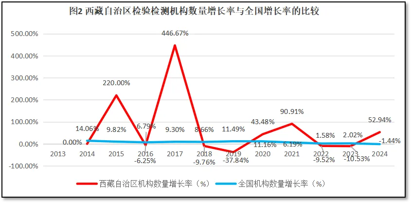 西藏自治区检验检测机构数量增长率与全国检验检测机构数量的增长率进行比较,结果如图2所示。