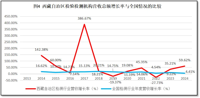 比较西藏自治区检验检测行业年度营收总额增长率与全国检验检测行业年度营收总额增长率随时间的变化,如图4所示。