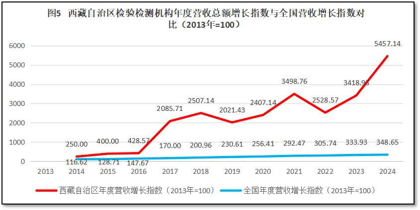 由上图可见,西藏自治区检验检测机构营收总额增长指数一直保持着高于全国平均数的水平发展,由于基数低,数据增大得很夸张,到2024年,西藏自治区检验检测机构营收总额增长指数比全国平均数高出5000以上,说明西藏自治区检验检测行业近些年有一些发展,但由于体量很小,虽然增长指数高,但实际的增量并不大。