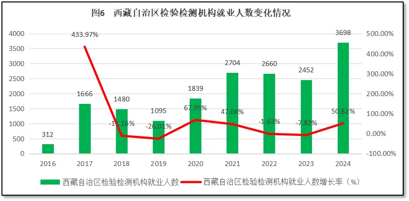 由图6可见,最近9年西藏自治区检验检测机构从业人员数量从2016年的312人逐步增长到2024年的3698人。从增长率曲线看,刨除一开始的异常数据,从2018年之后西藏自治区检验检测机构从业人数增长率总体呈现波浪式起伏的发展特点,2020年曾有一个67.95%的增长峰值,此后增长率快速下降,2024年度又出现一个50.82%的增长高峰。