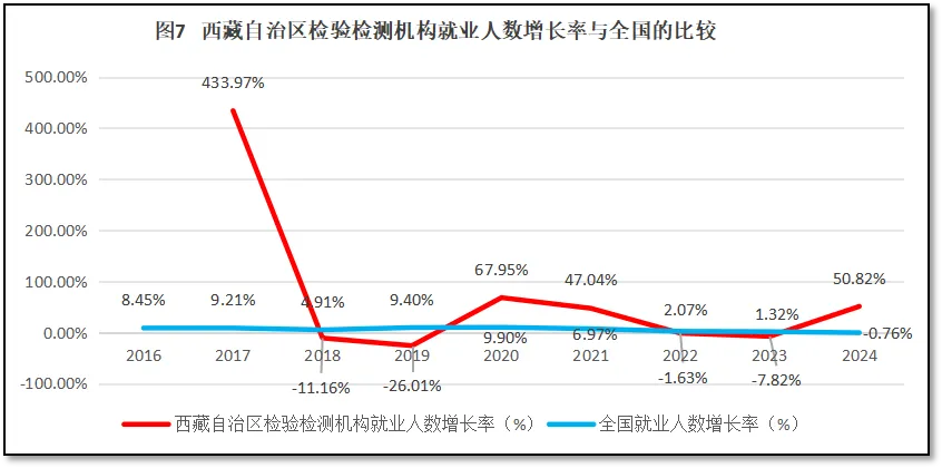 西藏自治区检验检测机构就业人数增长率与全国检验检测机构就业人数增长率的比较如图7所示。