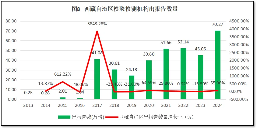 从图8来看,十二年来,西藏自治区检验检测机构对外出具报告数量起伏很大,从2016年的1.04万份迅速增长到2017年的41.08万份,此后逐步减少,到2020年左右又回升,2024年出具报告飞涨到70.27万份,同样显示统计数据的失真情况严重。