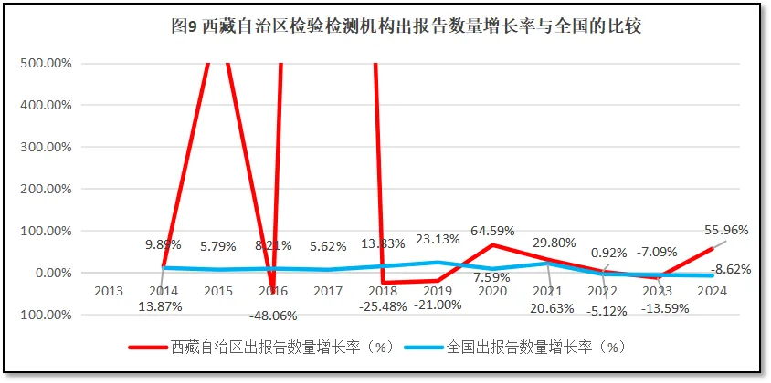西藏自治区检验检测机构出具报告数量的增长率与全国检验检测机构出具报告增长率的比较如图9所示。由于西藏检验检测机构出具报告数量的异常增长,相关统计数据已经没有分析价值,在此仅罗列客观数据。